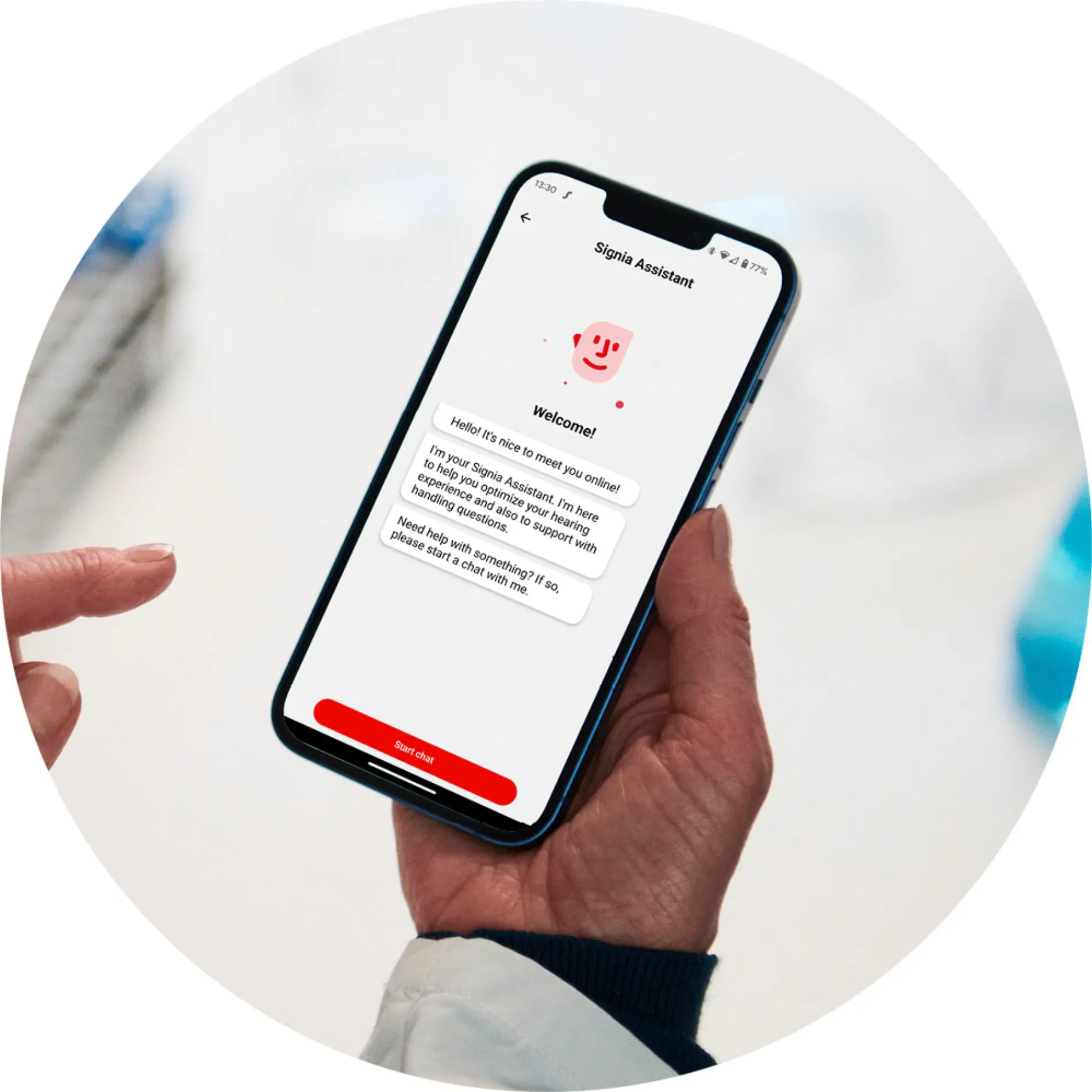El Asistente Signia es su amigable asistente de inteligencia artificial y ofrece soporte las 24 horas, los 7 días de la semana para personalizar el sonido y solucionar problemas.