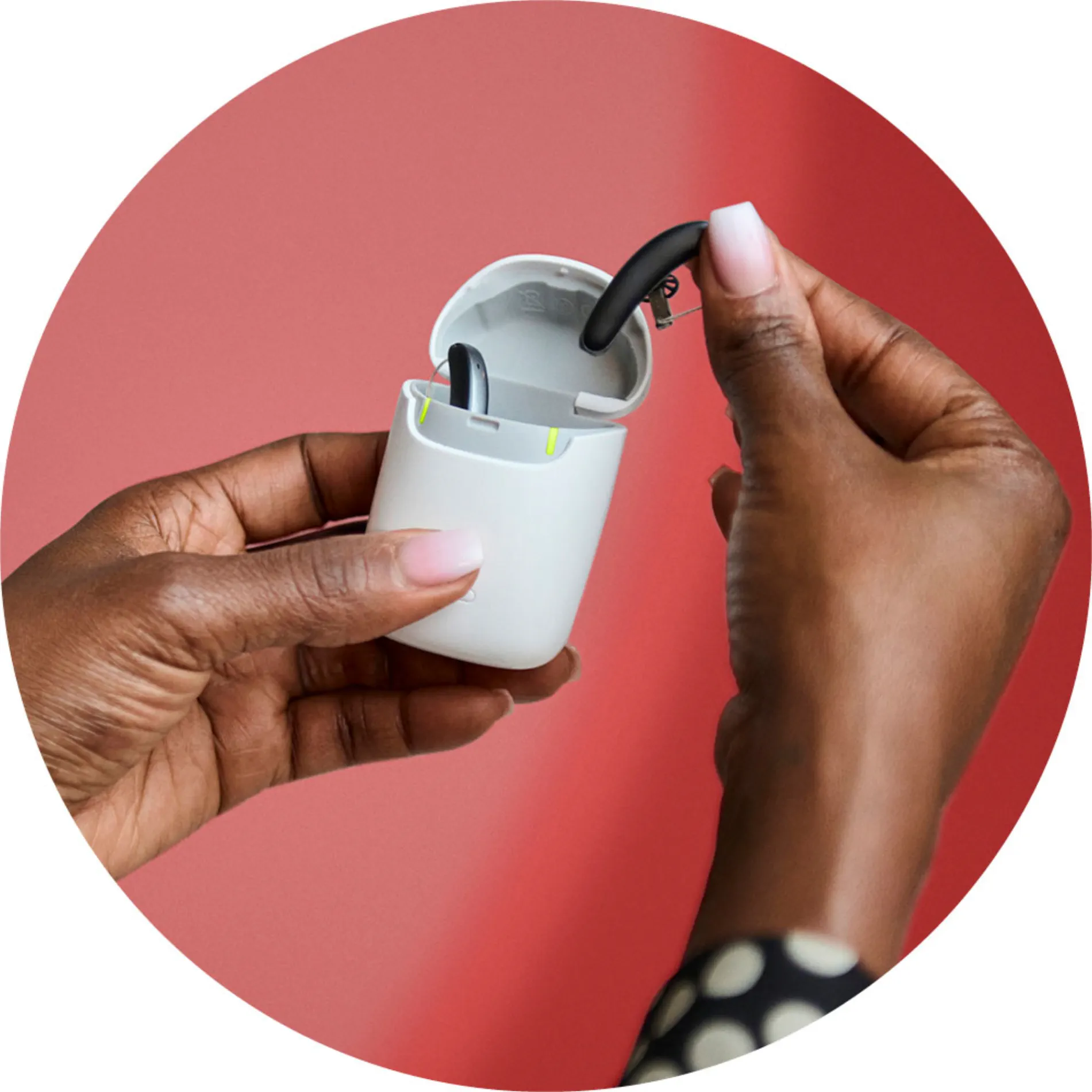 Un diseño fino, elegante y cómodo con funciones avanzadas que le permiten participar en la conversación, incluso en entornos ruidosos. Con una batería recargable que dura todo el día y un práctico estuche de carga portátil. Adecuado para personas con pérdida auditiva de leve a severa.